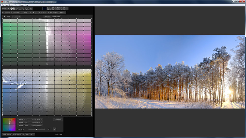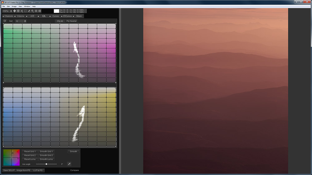 Цветокоррекция в 3D LUT Creator'e происходит с помощью изгибания сетки, привязанной к цветовой плоскости, содержащей насыщенность и оттенок. Использование подобного интерфейса позволяет в несколько кликов как полностью изменить цветовую гамму изображения, так и работать с нужными цветовыми диапазонами по отдельности.
